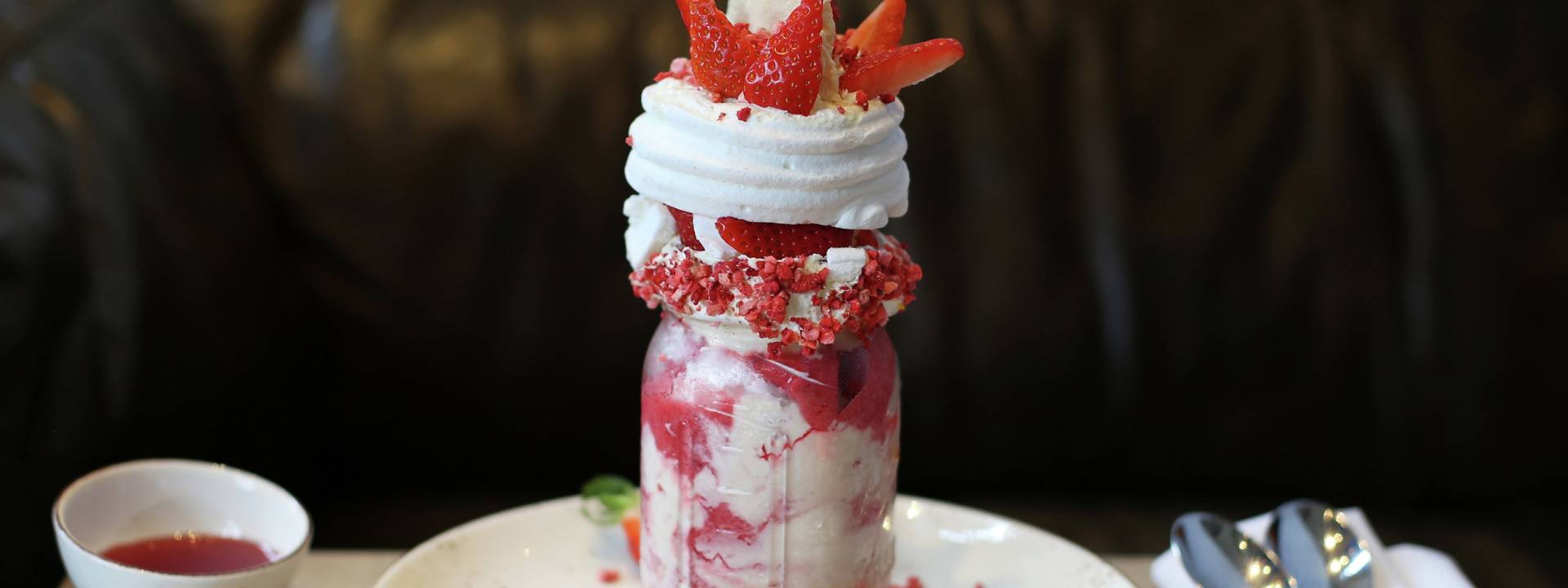 - Spread more cream around the outside top edge of the glass and sprinkle strawberry crunch or hundreds and thousands onto the cream so that it sticks to the glass. Set in the fridge for twenty minutes.