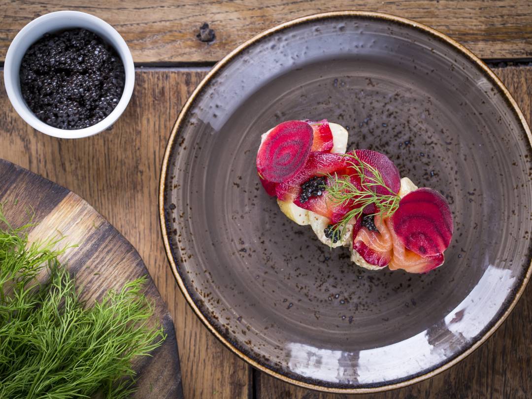 - Choose the best looking slices of beetroot and arrange them on the salmon, around three per portion.